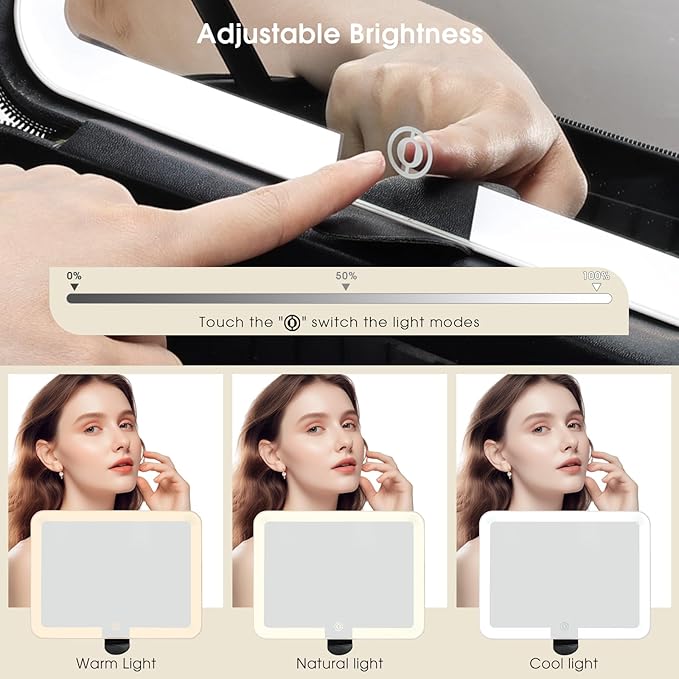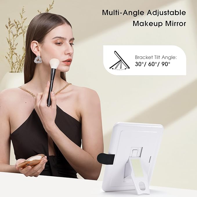 - 【3 COLOR FILL LIGHT MIRROR】- Makeup case with a smart full-screen illuminated mirror that can be independently removed for use. The mirror frame is adjustable at 30°, 60°, and 90° angles. A gentle touch of the switch allows for effortless adjustment between cold, neutral, and warm color temperatures, while a long press can vary the brightness from 0% to 100%. This functionality ensures that your face accurately reflects skin conditions and facial details, whether you are applying an exquisite party look, a commuting makeup style, or daily makeup.