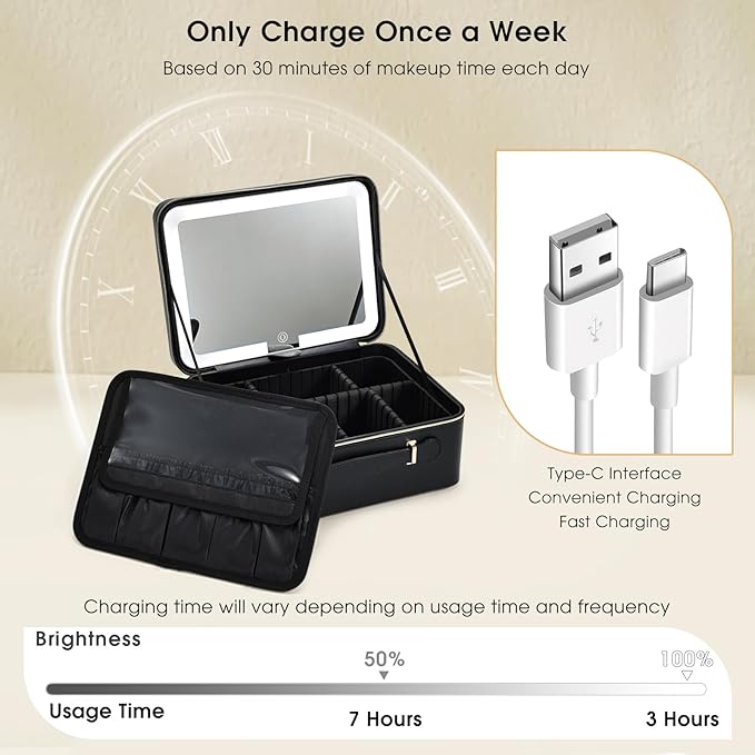- 【ONLY CHARGE ONCE A WEEK 】- The LED mirror is equipped with a built-in 2000mAh battery, alleviating concerns about battery life during use. Based on an average daily makeup time of 30 minutes, it typically requires charging only once a week. It is important to note that charging duration may vary depending on usage time and frequency.