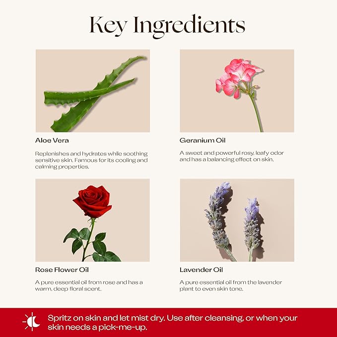 • Natural Aromatics: Infused with rose, geranium, and lavender oils for a calming, toning, and cooling effect