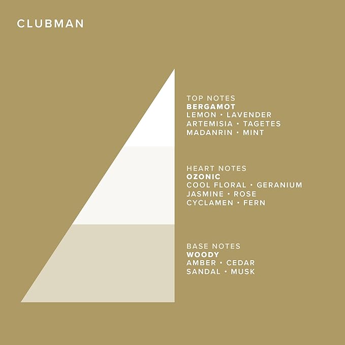 • CLUBMAN SCENT: Crisp and clean, Clubman is a fresh aromatic fragrance characterized by top notes of marzipan, bergamot, lemon, lavender, mandarin, and mint with a heart of patchouli, cinnamon, rose, orris, sandal, and carnation, resting on a base of moss, leather, amber, vanilla, musk, and tonka