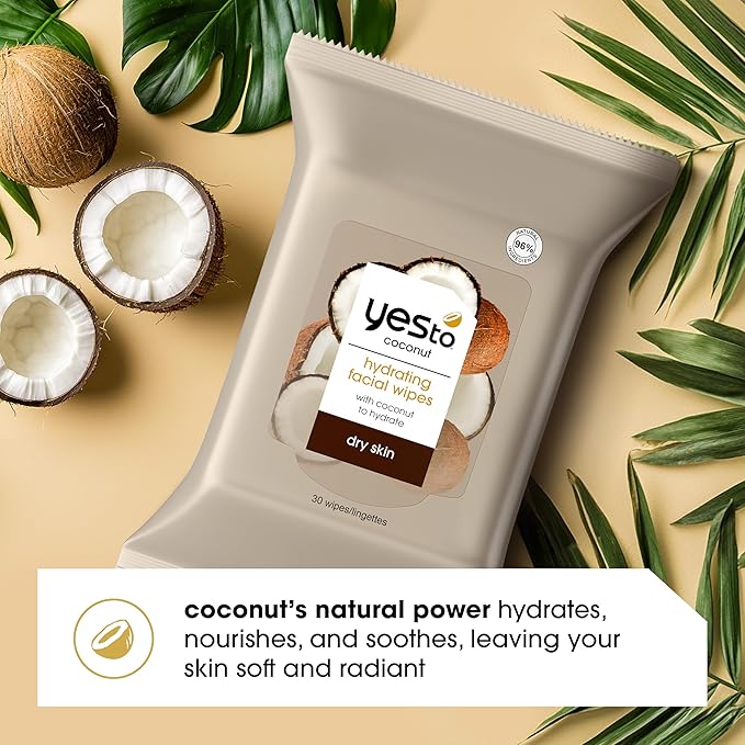 Yes To Face Wipes for Women and Men, Restoring Facial Cleansing Wipes for use as a Make Up Remover, Cleaning, Soothing, Coconut (Pack of 2)