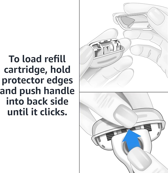• To load refill cartridge, hold the larger half of the cartridge with blades facing down, remove plastic top, and push razor into the back of cartridge until it clicks