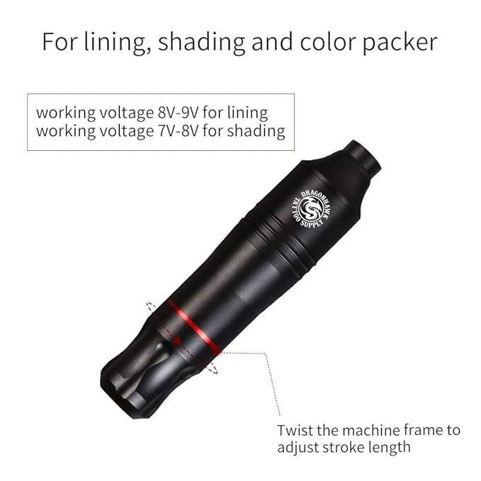 • Dragonhawk Tattoo Pen Kit: It has main supplies to start your tattoo work, the tattoo pen has 3.5mm stroke length that better for starter get easy tattoo lining and shading, permanent makeup work.