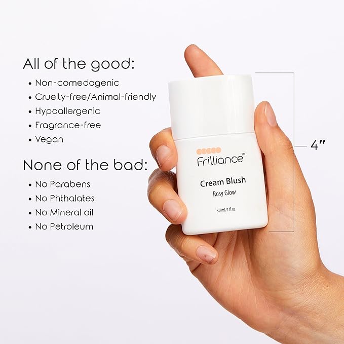 • SHEER HYDRATION: 30 ml / 1 fl oz Bottle of Frilliance Hydrating Cream Blush, Sheer Rosy Tint. Donโ€™t rely on your auntie to pinch your cheeks for a healthy glow! This skin-friendly rosy tint is just the right amount of sheer color that both hydrates and puts roses on your cheeks.