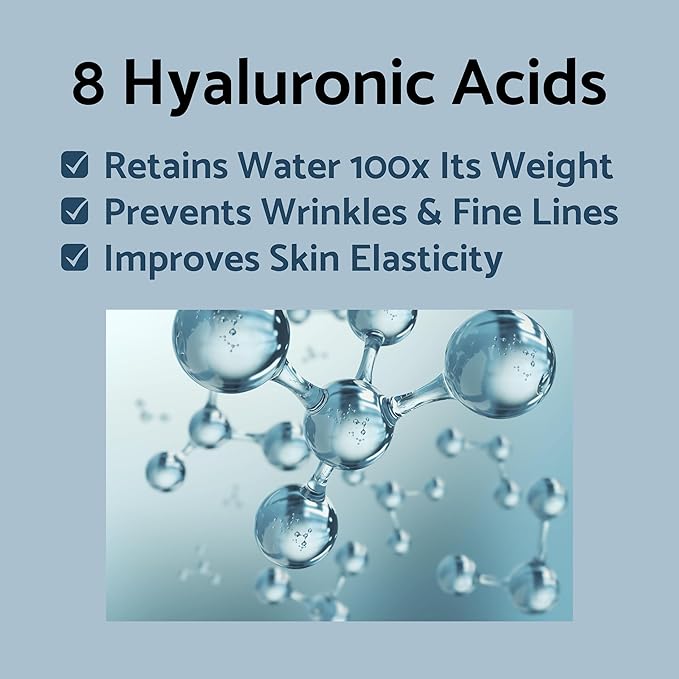 • 💦 Multi-Level Hydration: Infused with a powerful combination of 8 types of Hyaluronic Acid, our cream locks in moisture up to 100 times its weight, ensuring 24-hour hydration for a plump, smooth complexion.