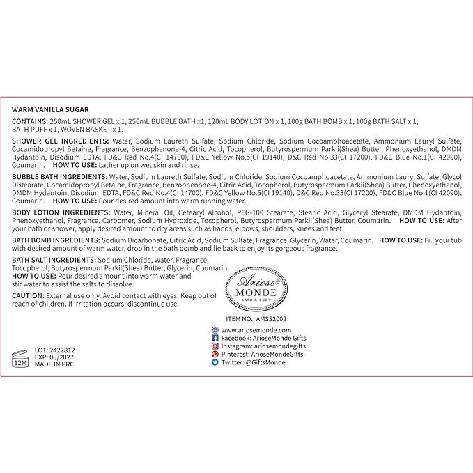 • NATURAL INGRIDENTS: All the Ariosemonde Spa sets are cruelty and praben free, We do not test our products on animals. They’re made from natural ingredients, they also give off a natural and gentle scent