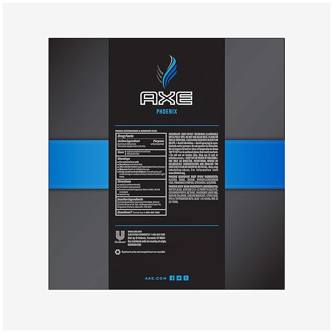 • AXE Gift pack includes one 4 oz AXE Phoenix deodorant Body Spray, one 2.7 oz Phoenix antiperspirant and Deodorant Stick and one 16 oz AXE Phoenix Body wash for men.