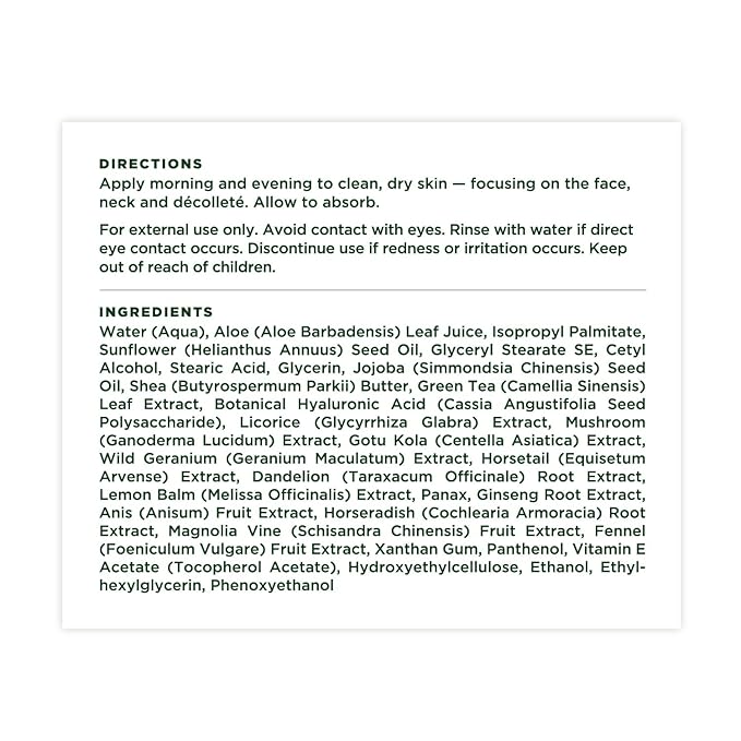 • Directions: Apply morning and evening to clean, dry skin — focusing on the face, neck and décolleté. Allow to absorb.