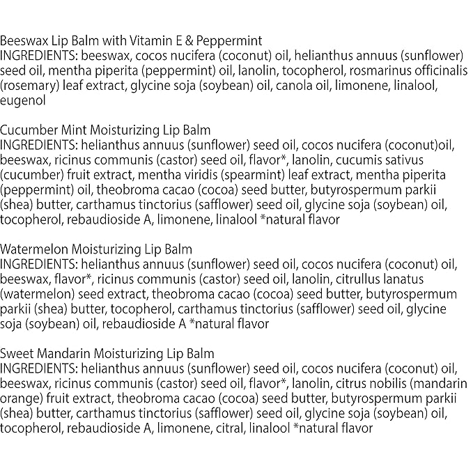• FOUR REFRESHING FLAVORS: Delight the senses with Beeswax, Cucumber Mint, Watermelon and Sweet Mandarin flavors that will encourage you to apply flavored lip balm over and over again