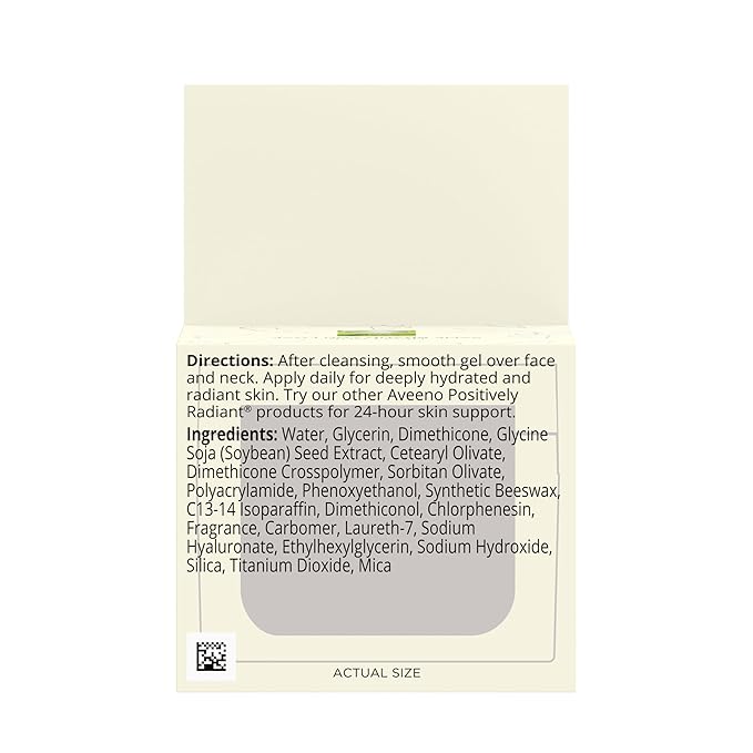 • 1.7-ounce jar of Aveeno Positively Radiant Daily Gel Facial Moisturizer with hyaluronic acid and clinically-proven tone-correcting soy evens skin tone and texture to reveal healthy-looking skin