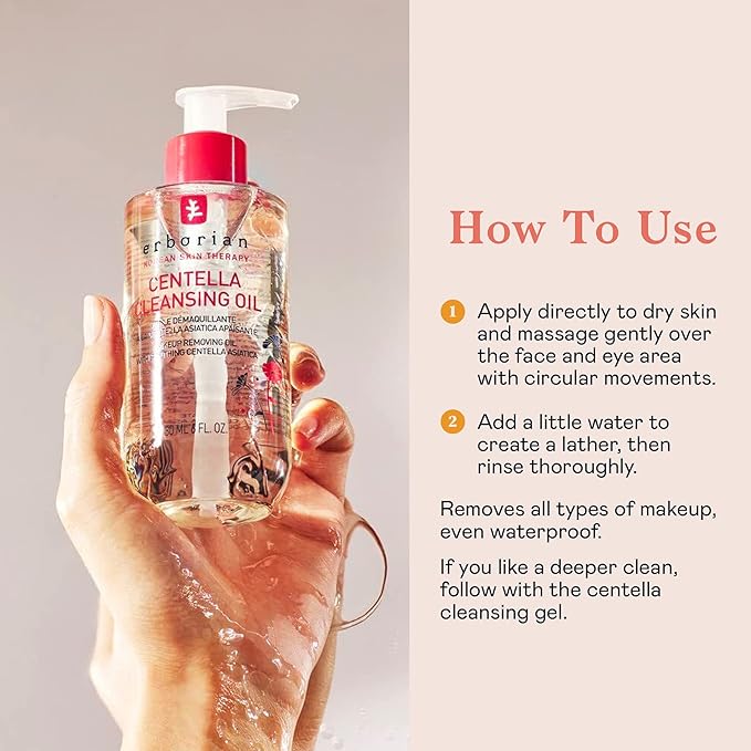 • Erborian Centella Cleansing Oil: This ultra-fine cleansing oil removes excess sebum, impurities, and even waterproof makeup while maintaining the skin's natural hydration. On contact with water, its light texture transforms into a milky lotion that works to remove makeup quickly, without leaving a greasy residue. 6 fl oz.