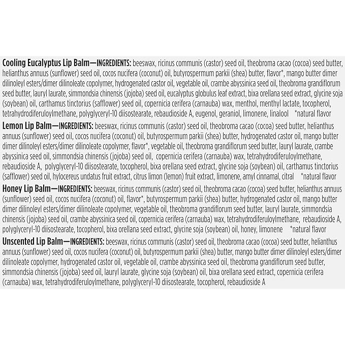• MOISTURIZING LIP BALM: Four 0.15 oz. lip balm tubes of Burt's Bees Rescue Balm, with one tube each of Cooling Eucalyptus, Lemon, Honey and Unscented lip balm