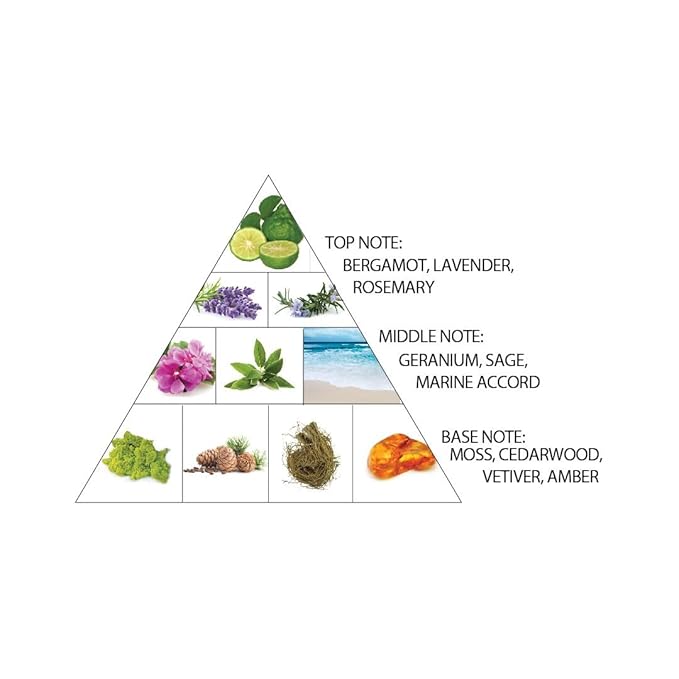 • MIDDLE Notes - Geranium, Sea Notes and Sage ; Base Notes - Vetiver, Amber, Moss and Cedar.