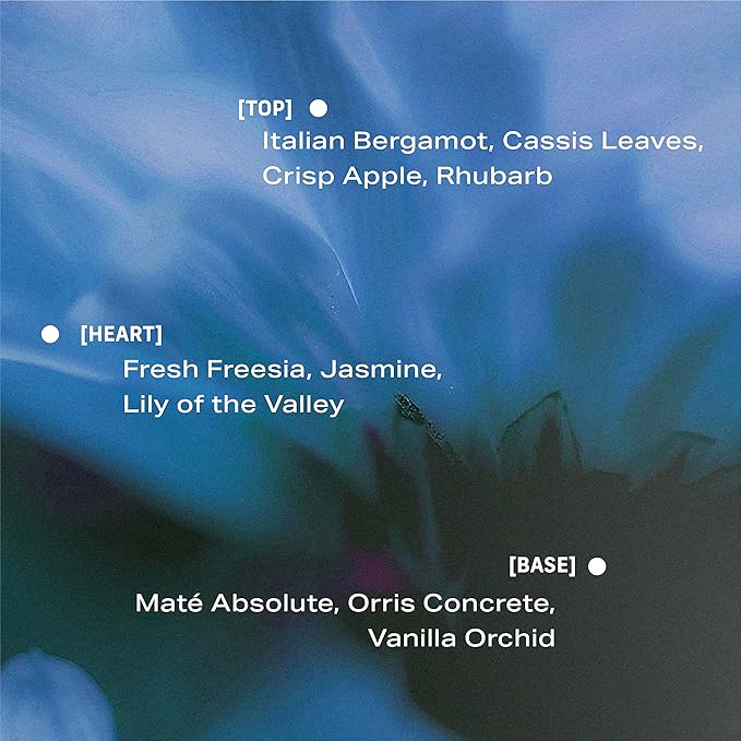 • SCENT NOTES: Top - Italian Bergamot, Cassis Leaves, Crisp Apple, Rhubarb. Heart - Fresh Freesia, Jasmine, Lily of the Valley. Base - Maté Absolute, Orris Concrete, Vanilla Orchid.
