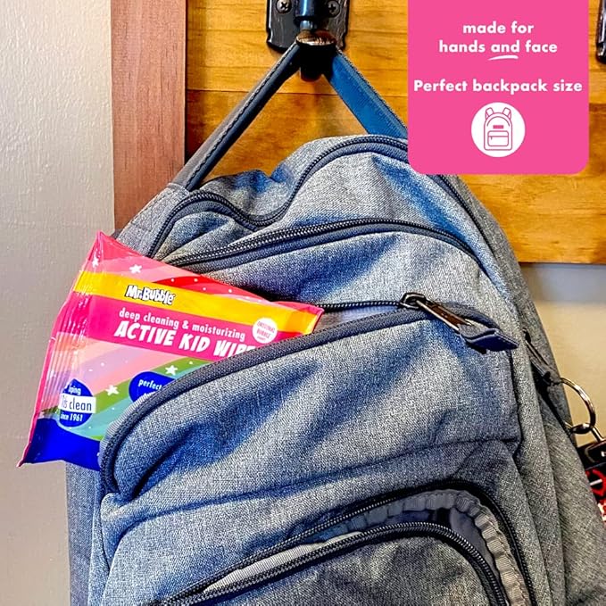 • TRAVEL-SIZE HEALTHY HYGIENE: Easily fit a pouch of Mr. Bubble cleansing hand and face wipes into school backpacks, purses, hiking waist packs, or any personal bag. Their compact size makes staying clean on-the-go simple, easy and enjoyable.