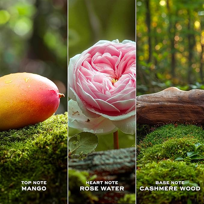 • Top Notes: Mandarin Essence, Mango & Pineapple Smell-the-taste; Heart Notes: Rosewater Firad, Orange Blossom Essence; Base Notes: Cashmere Woods