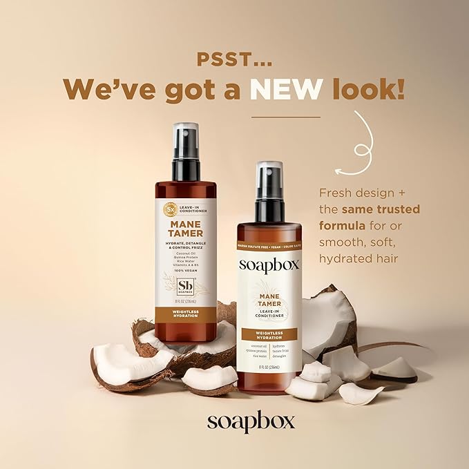 Soapbox Mane Tamer, Leave-In Conditioner Spray to Tame Frizz, Smooth Fly Aways, Hydrate, Add Shine & Detangle Dry, Damaged Hair, Paraben Free, Vegan (8oz)
