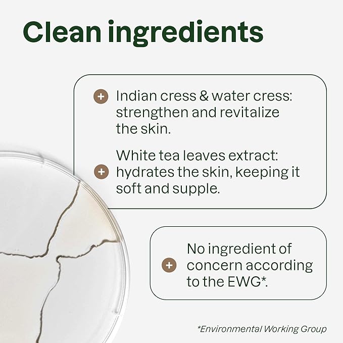 • NATURALLY SOURCED INGREDIENTS: Made with 98.8% naturally sourced ingredients* including white tea leaf extract that revitalizes, hydrates, and protects the skin, leaving it feeling soft and smooth, as well as watercress and Indian cress extracts known to revitalize dry skin and restore the skin’s suppleness *According to ISO 16128 standards