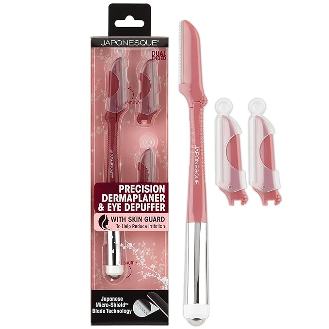 JAPONESQUE Dermaplaner and Cooling Eye Roller - Dual Ended Dermaplaning Facial Razor with Soothing Roller Ball Massager- Tool for Exfoliation, Hair Removal, Face Massage