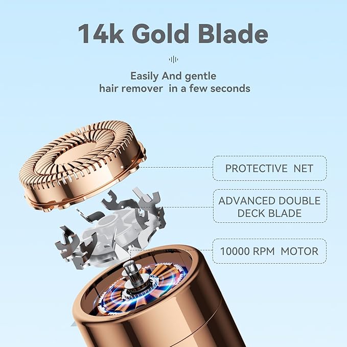 • [Painless Women's Facial Hair Removal] This hair removal device perfectly fits the contours of our body, gently gliding over skin to trim hair off. Facial hair remover features 14k gold plating rounded low-friction protection heads for a smooth complexion without stubble, nicks or redness.