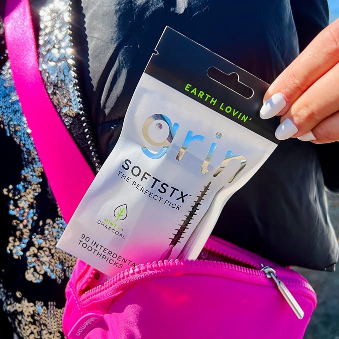 Grin Charcoal Infused Softstx, Gentle Dental Picks, 90 Count, Soft Flexible Bristles, Textured Plaque Removing Toothpick, Minty Flavor, for Between Teeth, Refillable Hygienic Case