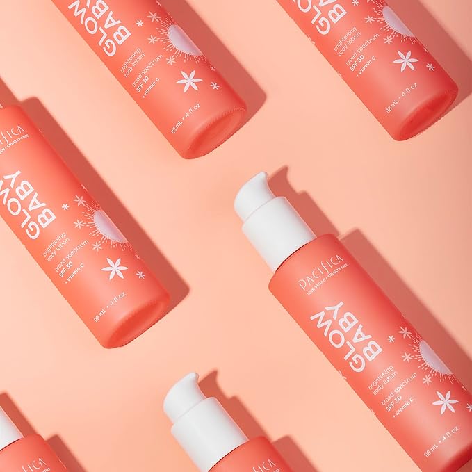 - BRIGHTENING VITAMIN C FOR GLOWING SKIN – Get instantly more radiant, even-toned skin with this vitamin C-enriched body lotion. Infused with Pacifica’s Glow Baby brightening complex featuring vitamin C and superfruit kakadu plum (a rich natural source of C), it targets dullness and helps fade the appearance of dark spots, sun damage, and discoloration while evening out skin tone and boosting overall luminosity. Your skin will drink up the antioxidants in this revitalizing formula, revealing a youthful radiance from neck to toe and improving the look of ashy, dull skin with every use.
