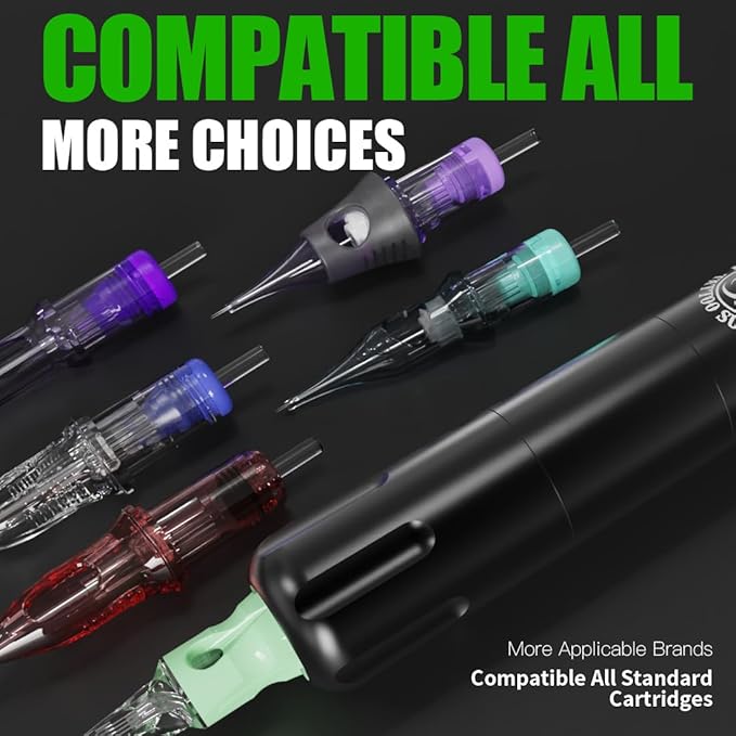 • Universal Compatibility: This pen is compatible with all cartridge needle types, its direct drive system delivers enhanced power, making it perfect for both liners and shaders, ensuring strong performance across a variety of tattooing techniques