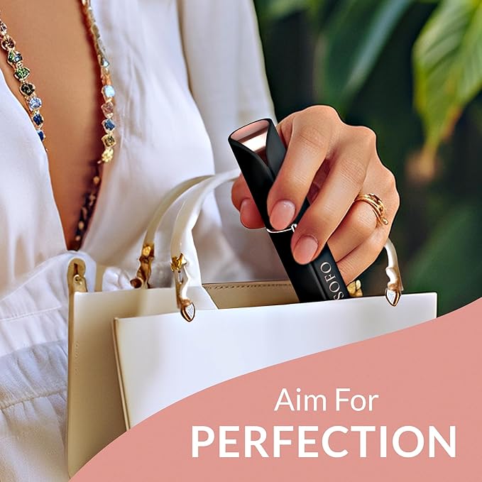 • The hair removal device is shaped like a tube of lipstick for discreet use and features VISOFO Technology that removes hair by microscopically paring it down with a spinning head covered by a plate.