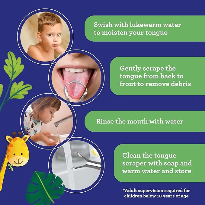• EFFORTLESS USAGE: Gently glide the scraper from back to front to remove debris, and achieve fresher breath and cleaner mouth. Washes easily with water. (Adult supervision is needed for children under 10 years.)