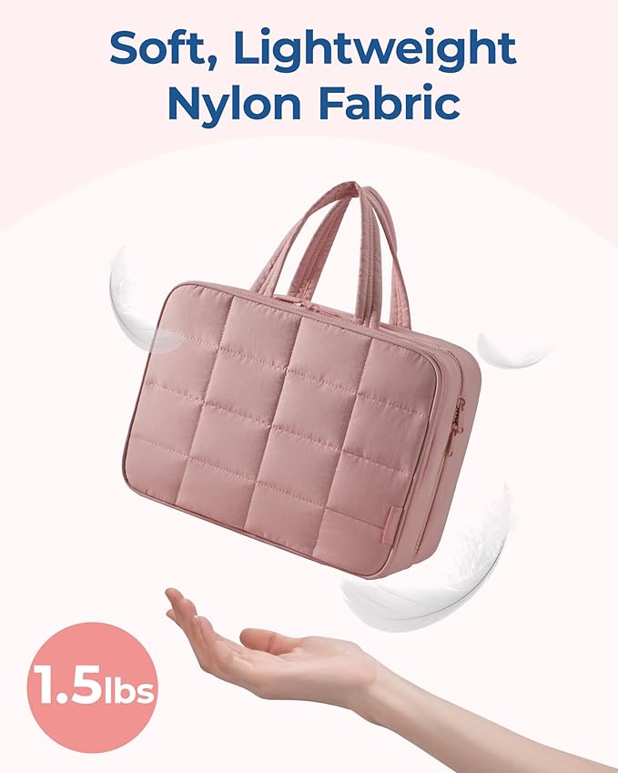 • 𝐏𝐮𝐟𝐟𝐲 𝐌𝐚𝐭𝐞𝐫𝐢𝐚𝐥𝐬: Hanging Toiletry Bag is made of puffy fabric and weighs only 1.1lbs-1.5 lbs. Super soft, lightweight nylon fabric provides all-day carry comfort
