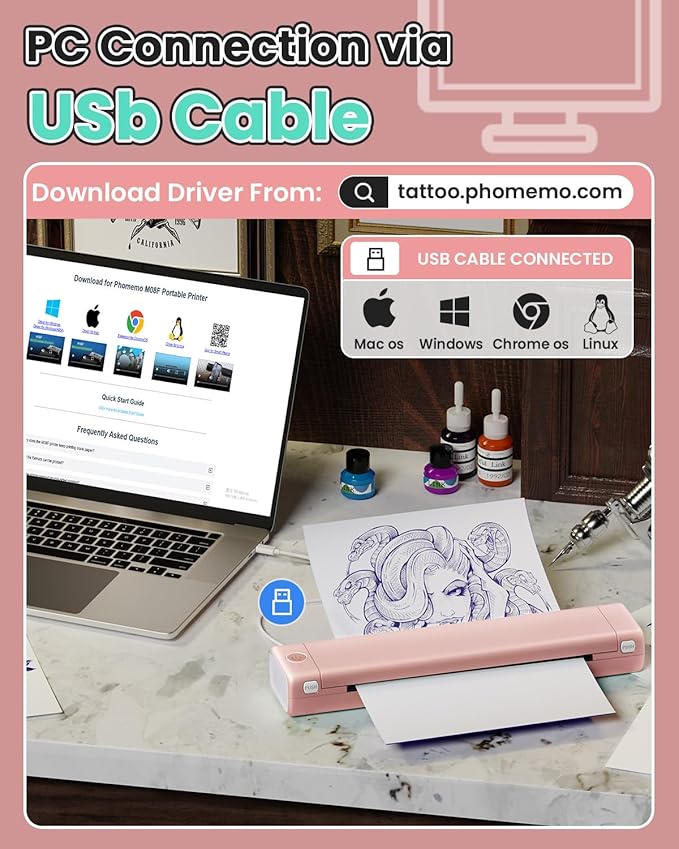 - Wired & Wireless Connection: Phomemo Tattoo Stencil Printer can be connected to smartphones and tablets via Bluetooth (Android & iOS); or laptops and desktop computers via USB cable (Windows, MacOS and ChromeOS). (Please update the latest firmware version through the official website to avoid malfunction.)