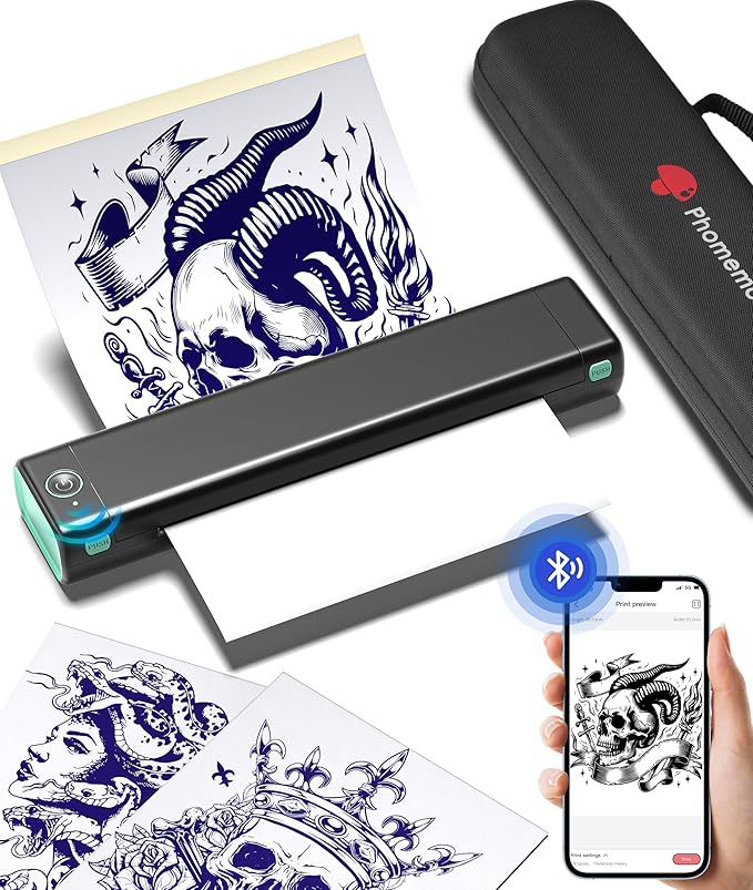 - 【Mobile App Control】No more complicated tattoo printing process! Easy to print images and documents with a single click via Phomemo App. It also offers a convenient scanning feature designed specifically for tattoo patterns. Scan your drawing from your phone and print with ease. For better printing results, we recommend using Phomemo tattoo transfer paper.