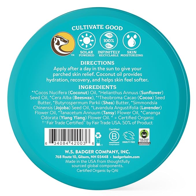 Badger Coconut AfterSun Balm, 100% Organic Soothing Sunburn Relief, Great Smelling, Moisturizing & Hydrating After Sun Skin Care, 2 oz Tin, 2-Pack