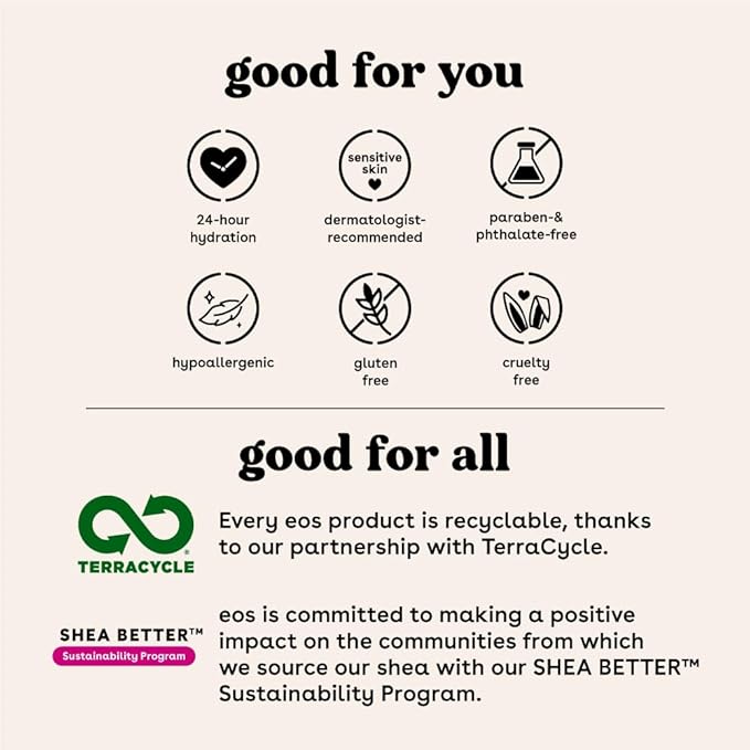 • SUSTAINABLY-SOURCED INGREDIENTS: eos lip balms have wild grown, sustainably sourced, natural shea butter and oil to leave your lips smooth and nourished