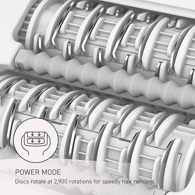 • Smooth, Supple Skin with Less Effort: Dual-disc epilation head has 60 rotating tweezers that open 140% wider than previous model to remove more hair in one pass; reaches hair that waxing can't -as short as 0.02 inches- for smooth, hair free skin
