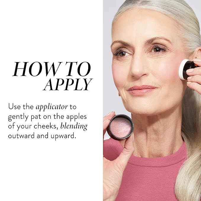 • HOW TO APPLY: Use the applicator to gently pat on the apples of your cheeks and blend outward and upward.