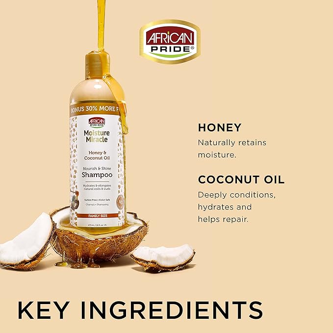• PROVEN HAIR CARE - African Pride Moisture Miracle Honey & Coconut Oil gently cleanses natural hair to remove dirt & buildup without stripping out natural oils. The blend of Honey & Coconut Oil hydrates & adds shine to natural coils and curls.