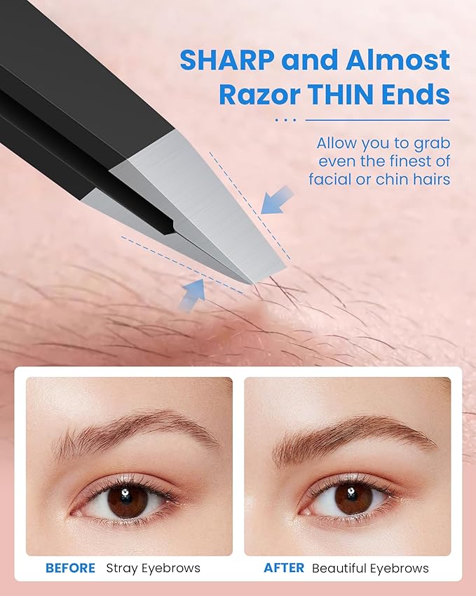 • 【Sharp SLANT TIPS for Every Hair】25° slanted tip is the perfect angle for removing unwanted hair. These ultra-fine tips grip the tiniest hairs effortlessly - from peach fuzz to stubborn chin hairs. Unlike flimsy tweezers, our professional-grade design removes hairs cleanly without breakage. Perfect for women's facial hair care routines and men's grooming kits alike.