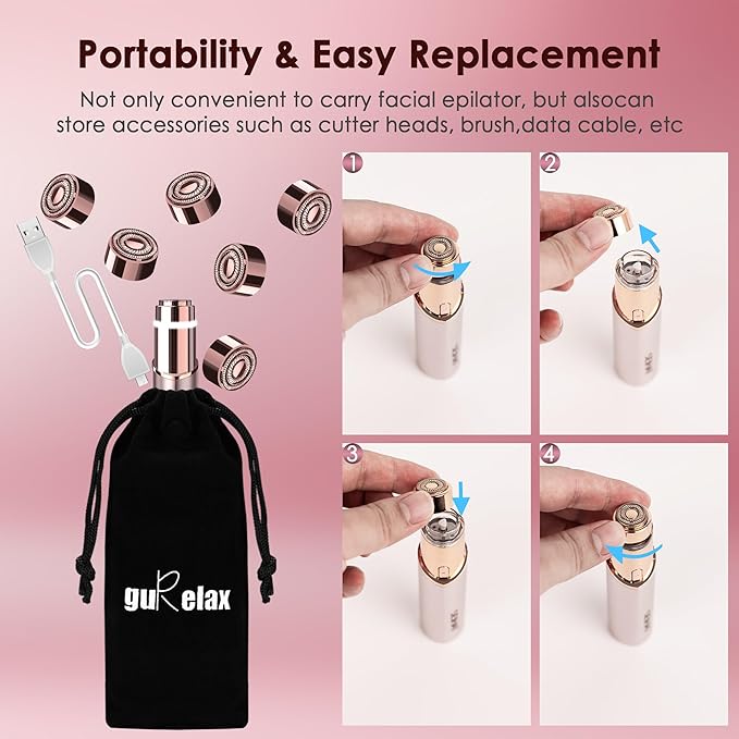 - 【Easy Replacement and Storage】This replacement hair removal head is small and portable, just like the original one, you only need to twist out the old replacement head and twist it back with the new one, easy to operate. The soft and elastic storage bag protects the perfect replacement head from dust, which can be used to carry the facial hair removal tool and store the replacement head, brush and data cable