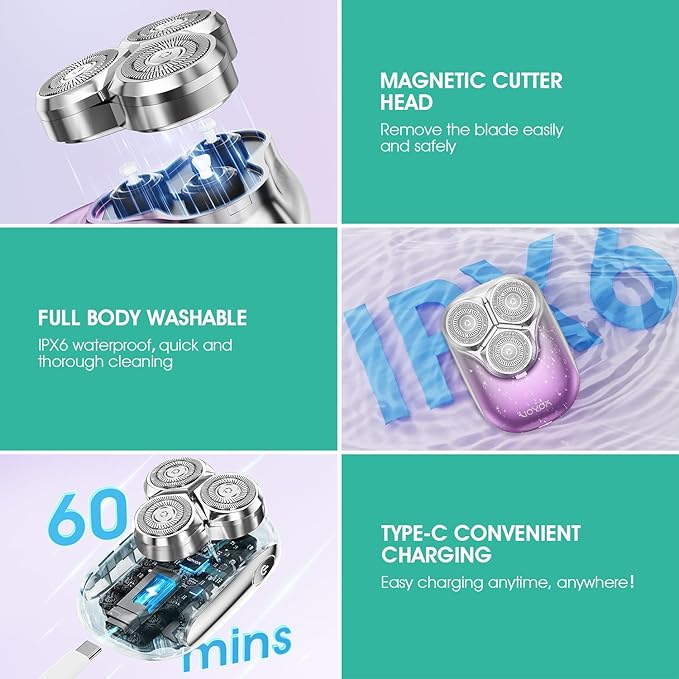 • Waterproof & Easy To Operate: Electric razor for women is IPX6 waterproof all over, can be used wet or dry! Magnetic head, easy to remove, can be rinsed directly under the running water, easy to clean. One-button operation is easy for both novice and experienced shavers!