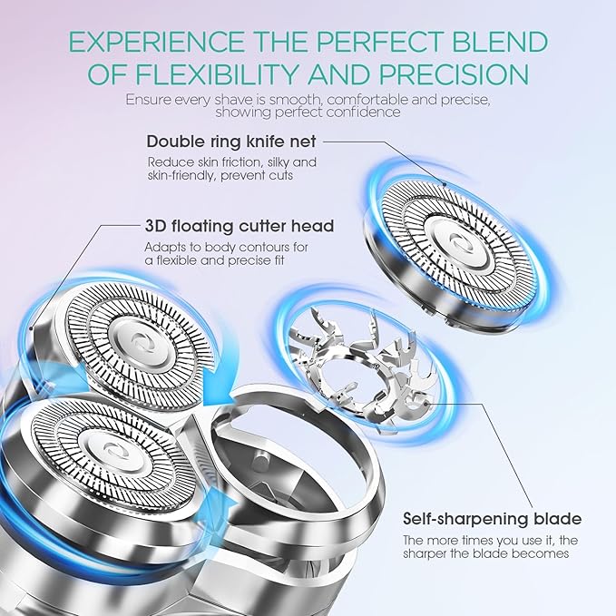 • Efficient And Long Lasting: 3D floating womens razors comfortably faces different contours and fits your body curves! Fast cutting with powerful motor, It shaves hair efficiently and closely. Internal self-sharpening blade design, blade and mesh grinding each other, the longer you use it, the sharper it gets, no need to worry about changing the blade frequently!