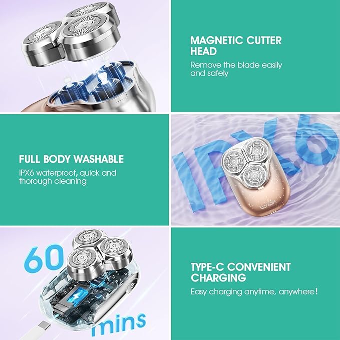 • Waterproof & Easy To Operate: Electric razor for women is IPX6 waterproof all over, can be used wet or dry! Magnetic head, easy to remove, can be rinsed directly under the running water, easy to clean. One-button operation is easy for both novice and experienced shavers!