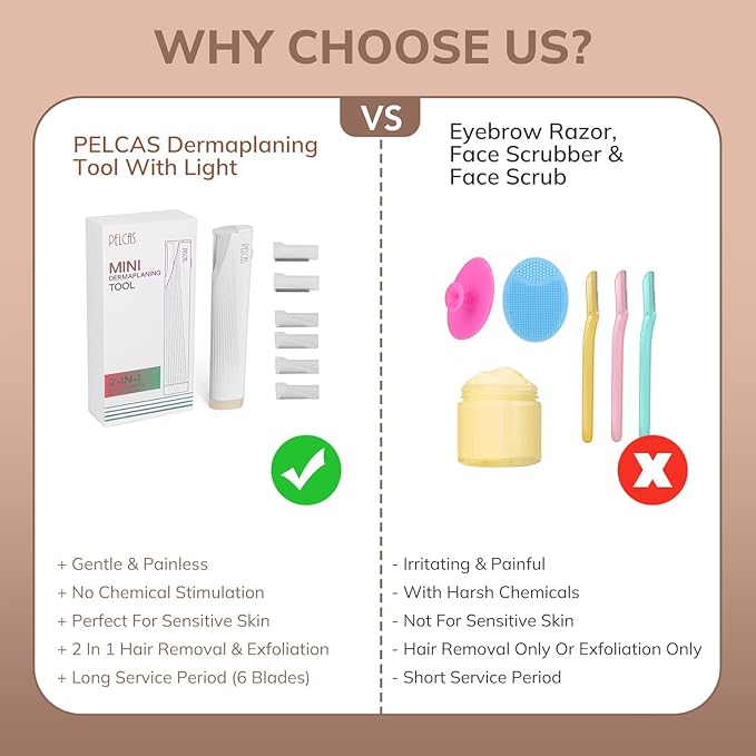 • [Great Quality & Service]-Package includes: 1*PELCAS Mini Dermaplaning Tool With Light (5.12*1.1 inches),1*Type C Charging Cable, 6* Replacement Blades(2 types) , 1*Manual. PELCAS provide 24H online reply.
