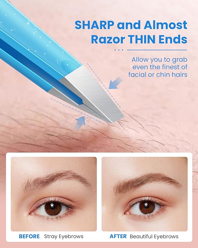 • 【Sharp SLANT TIPS for Every Hair】25° slanted tip is the perfect angle for removing unwanted hair. These ultra-fine tips grip the tiniest hairs effortlessly - from peach fuzz to stubborn chin hairs. Unlike flimsy tweezers, our professional-grade design removes hairs cleanly without breakage. Perfect for women's facial hair care routines and men's grooming kits alike.
