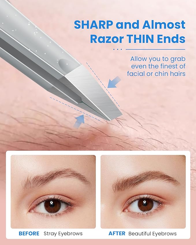 • 【Sharp SLANT TIPS for Every Hair】25° slanted tip is the perfect angle for removing unwanted hair. These ultra-fine tips grip the tiniest hairs effortlessly - from peach fuzz to stubborn chin hairs. Unlike flimsy tweezers, our professional-grade design removes hairs cleanly without breakage. Perfect for women's facial hair care routines and men's grooming kits alike.