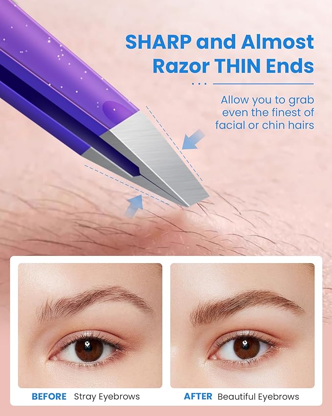 • 【Sharp SLANT TIPS for Every Hair】25° slanted tip is the perfect angle for removing unwanted hair. These ultra-fine tips grip the tiniest hairs effortlessly - from peach fuzz to stubborn chin hairs. Unlike flimsy tweezers, our professional-grade design removes hairs cleanly without breakage. Perfect for women's facial hair care routines and men's grooming kits alike.