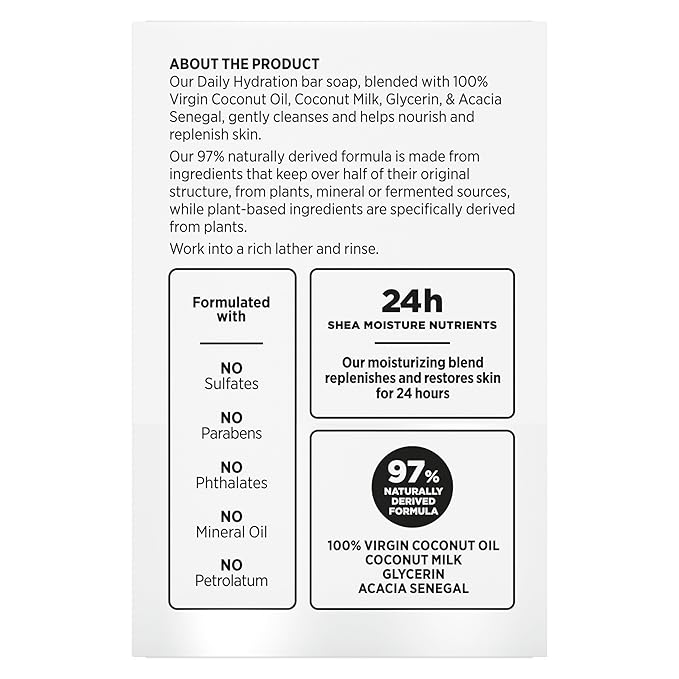 • SheaMoisture's 100% Virgin Coconut Oil Daily Hydration Bar soap, designed for melanin-rich skin, replenishes and restores skin for 24 hours.