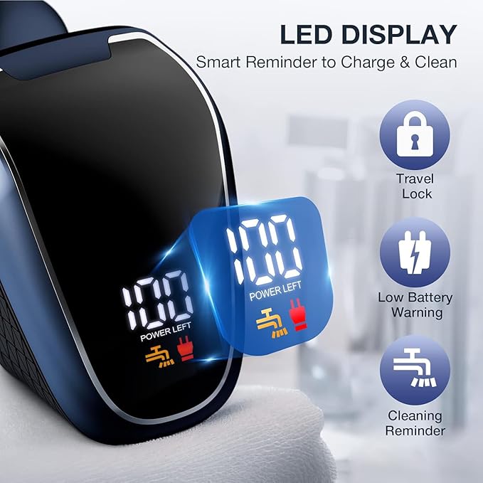 • LED Smart Display: The built-in LED display clearly shows the battery level, so you always know when it’s time to recharge. It also features smart reminders for low battery and cleaning, making the shaver more user-friendly