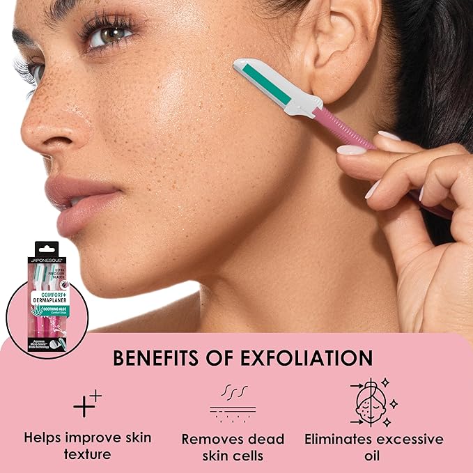 • INSTANTLY GLOWING, SILKY-SMOOTH SKIN: The Japonesque Comfort+ Dermaplaner combines ultra-precision Japanese blades and a soothing aloe comfort strip leaving your skin visibly brighter and softer.