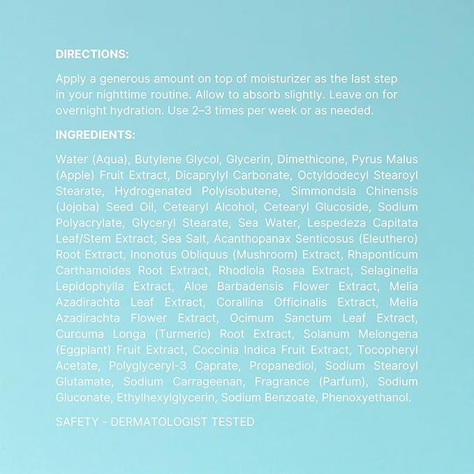 • Bioadaptive Botanicals: Infused with a blend of adaptogens including Rhodiola, Maral Root, Siberian Ginseng, and Chaga Mushroom, this mask helps your skin adapt and bounce back from daily Issues.